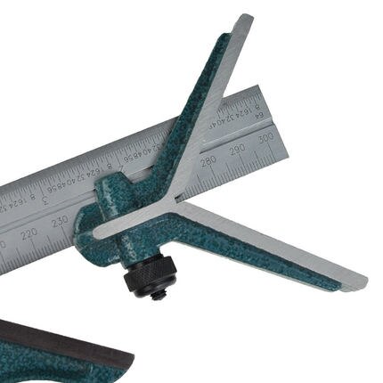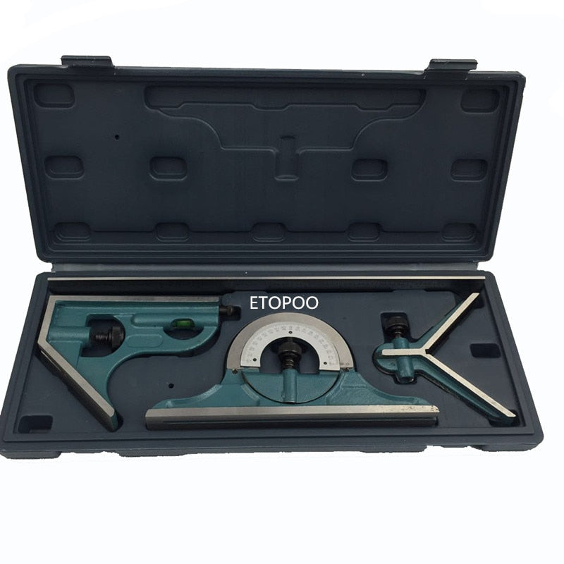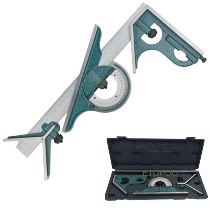 Jogo de esquadros combinados completo é composto por esquadro principal (para 90 e 45 graus), esquadro de centragem e transferidor de ângulos. Feito em material resistente. Permite medições lineares, esquadrejamento e traçagem com estabilidade.